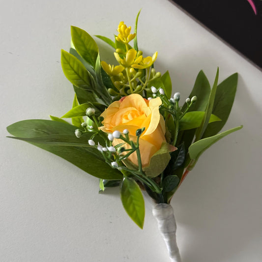 Artificial wedding single yellow rosebud with foliage buttonholes. Ideal for spring/summer weddings