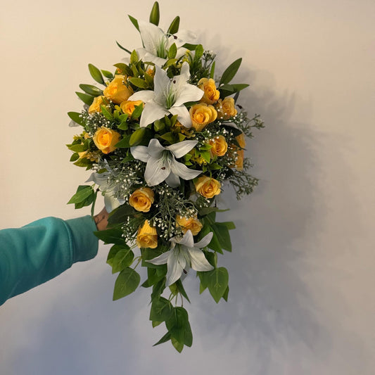 Artificial wedding bridal teardrop bouquet with white Lilys, yellow rosebuds and foliage. Ideal for spring/summer weddings