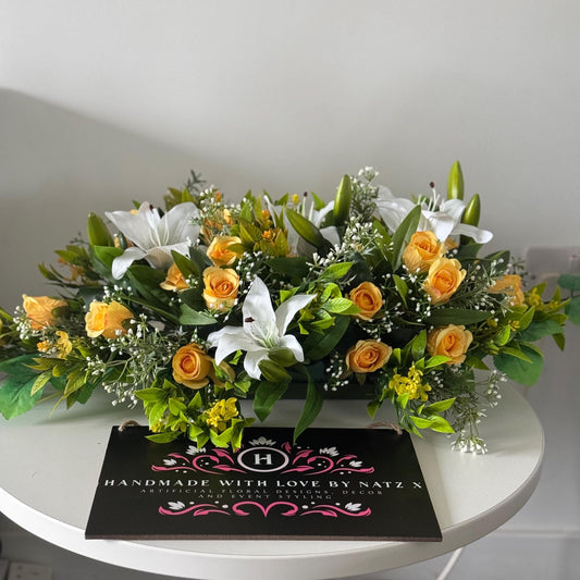 Artificial wedding table centre piece, with white Lilys, yellow rosebuds and foliage. Ideal for spring/summer weddings