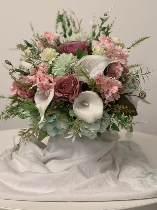 Artificial wedding bridal bouquet with blush pink roses, ivory lilies, sage green spikey chrysanthemums and foliage