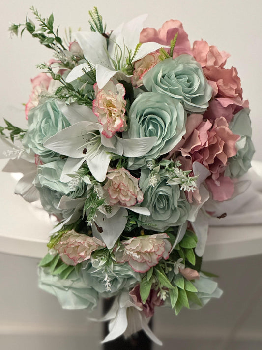 Artificial wedding bridal teardrop bouquet with blush pink hydrangeas , sage green roses and white Lilies with foliage