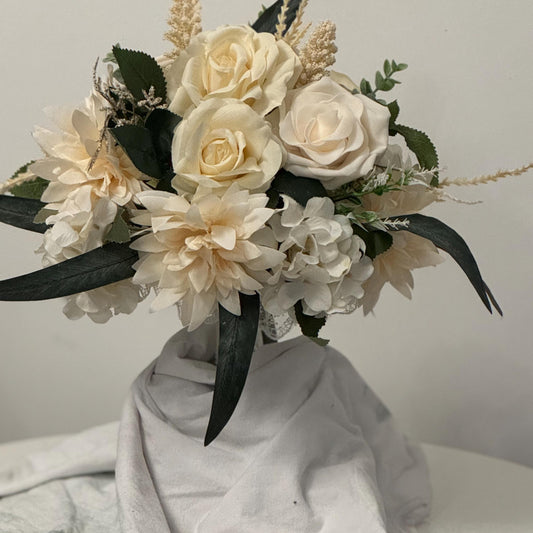 Artificial wedding bridal bouquet with all ivory flowers and foliage