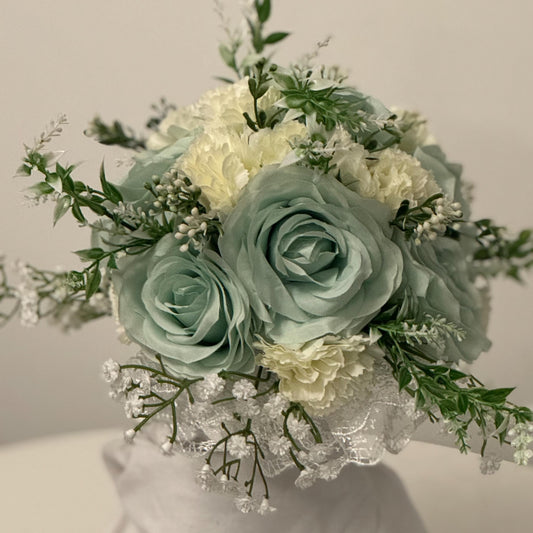 Artificial wedding bridal bouquet with sage green roses and ivory carnations with foliage