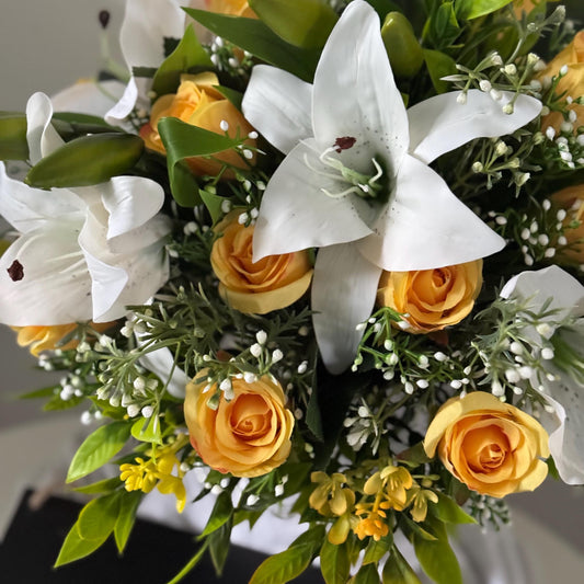 Artificial wedding table centre piece, with white Lilys, yellow rosebuds and foliage. Ideal for spring/summer weddings