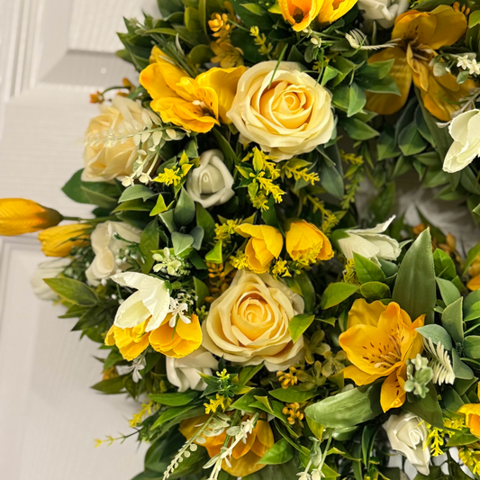 Lemon rose with yellow/white crocus, ivory rose buds and foliage wreath