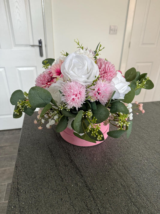 Vendor:Handmade with Love by Natz xRegular price From £25.00 GBPRegular priceUnit price perSale price From £25.00 GBPStunning luxury pink suede hat box with artificial pink and white flowers and leaves