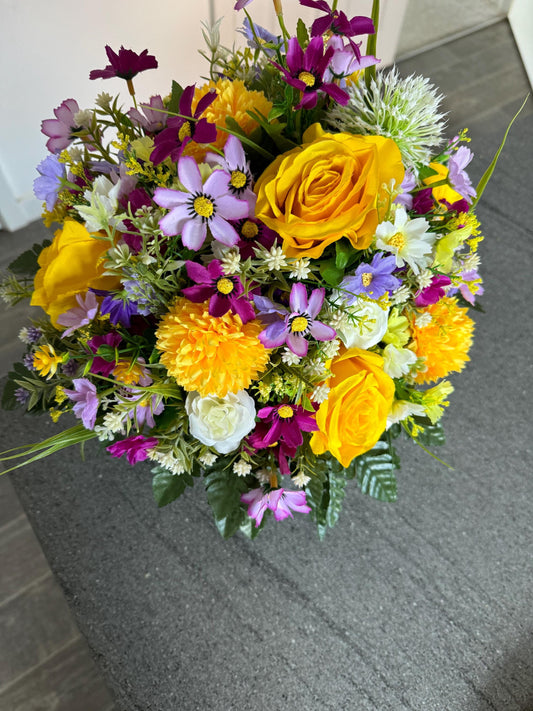 Artificial wedding table centre piece, with white Lilys, yellow rosebuds and foliage. Ideal for spring/summer weddings