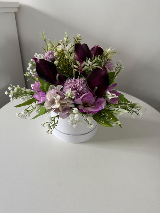 Regular price From £25.00 GBPRegular priceUnit price perSale price From £25.00 GBPWhite hat box, filled with artificial greenery, lilac flowers and deep purple calla Lillies.